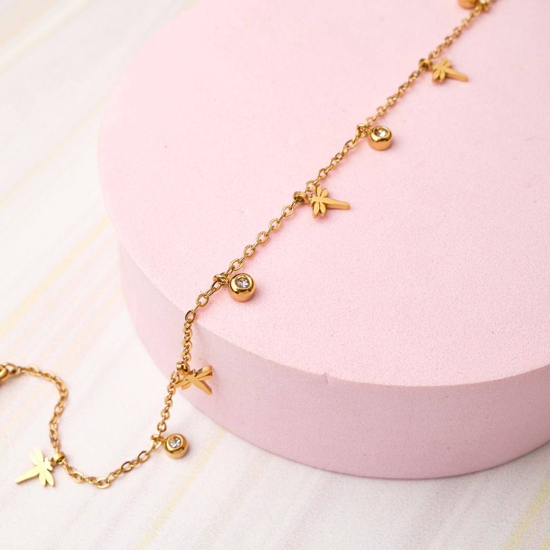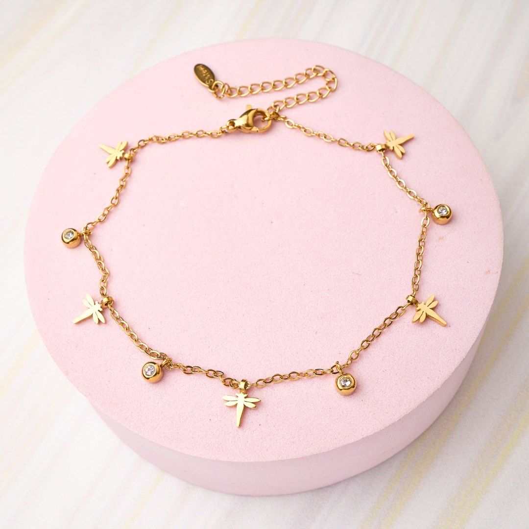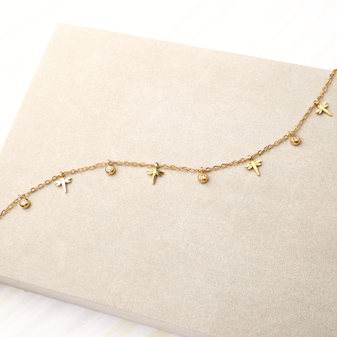 La tobillera de libélulas Waterproof de acero inoxidable 316L es una joya cargada de simbolismo: las libélulas representan transformación, libertad, evolución y buena fortuna. Es un accesorio delicado y femenino que acompañará tus pasos con estilo y propósito todos los días.